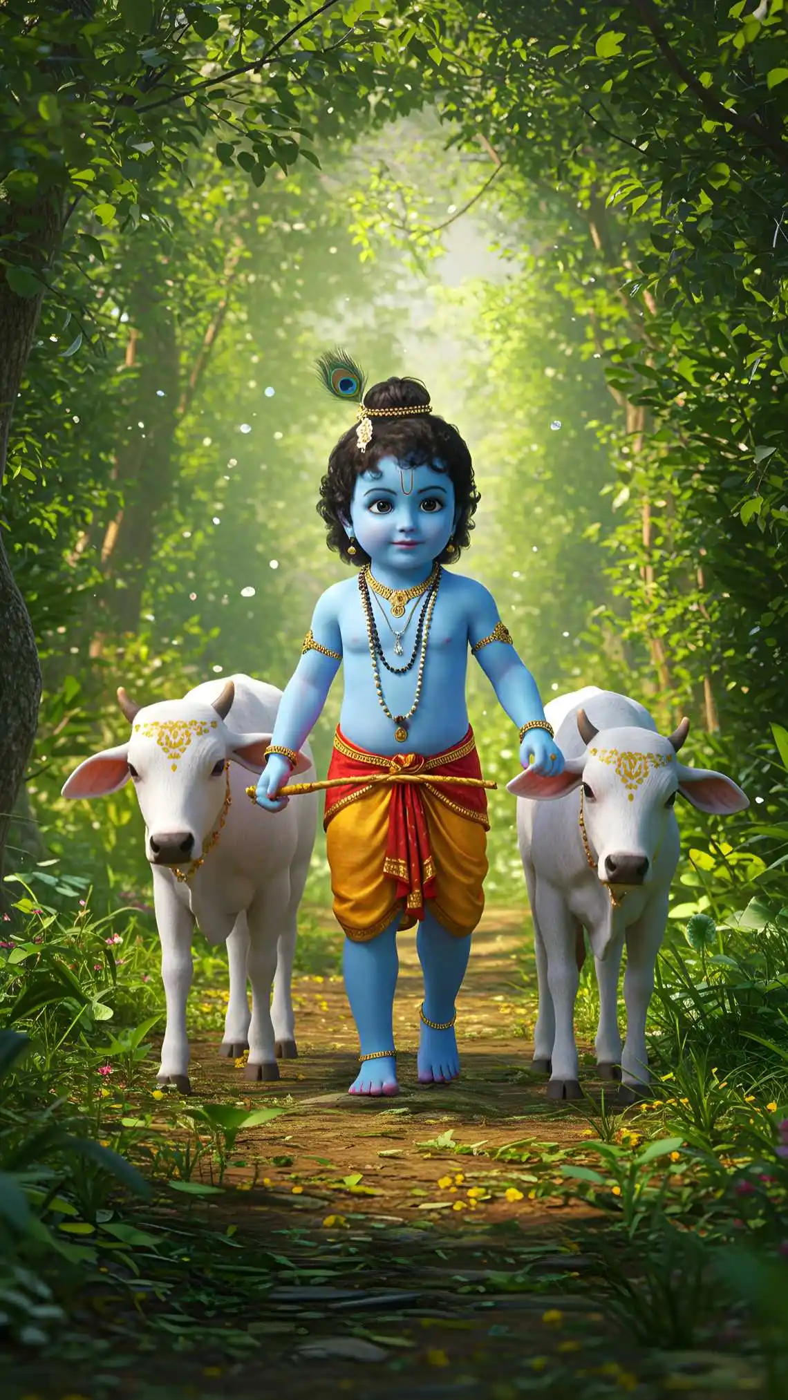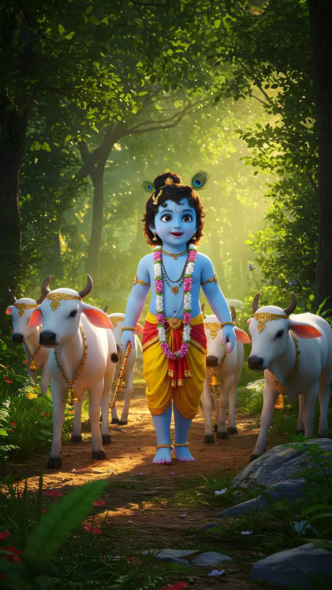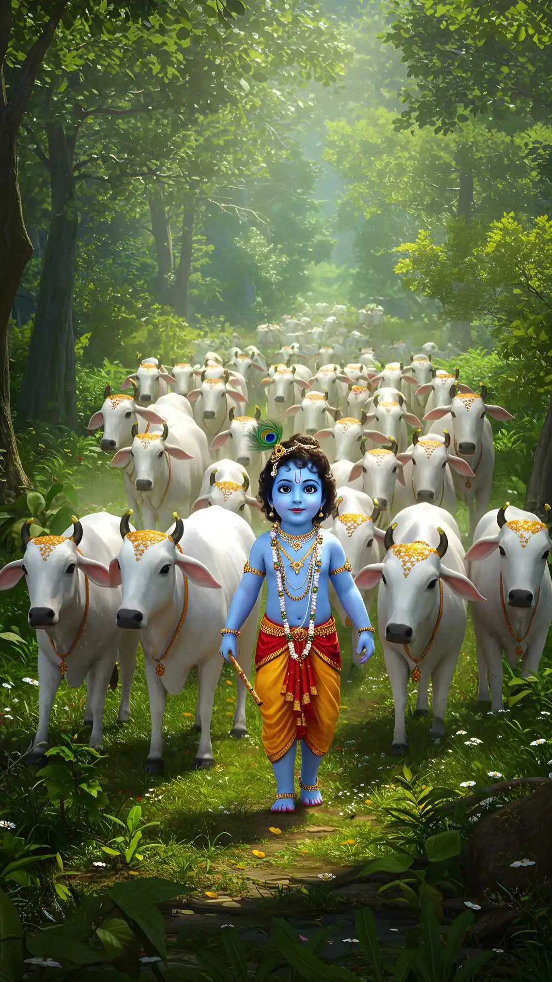 This is a high-quality digital artwork featuring Bal Krishna, the divine child form of Lord Krishna, walking peacefully with sacred cows in a lush green forest.