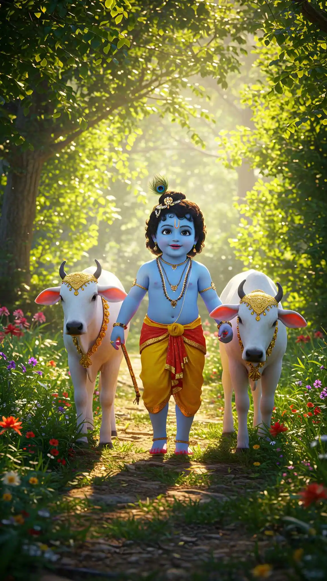 The image beautifully represents innocence, divine love, protection of nature, and गौ-सेवा (care for cows).