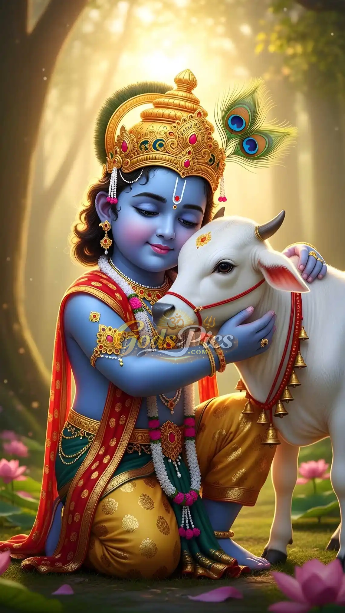 The image beautifully represents innocence, divine love, protection of nature, and गौ-सेवा (care for cows).