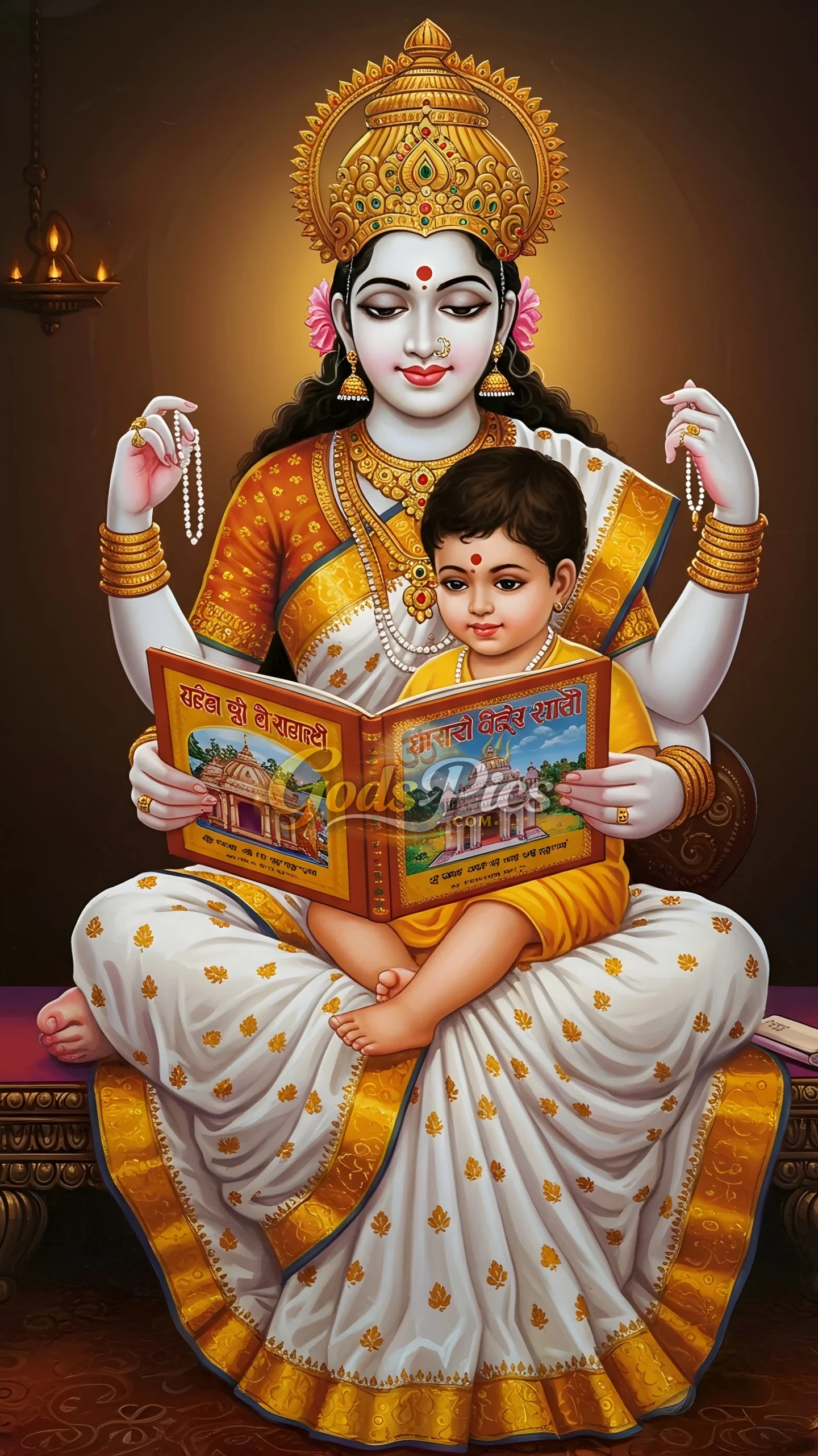 📚 Peaceful artwork of Goddess Saraswati guiding a child with sacred knowledge