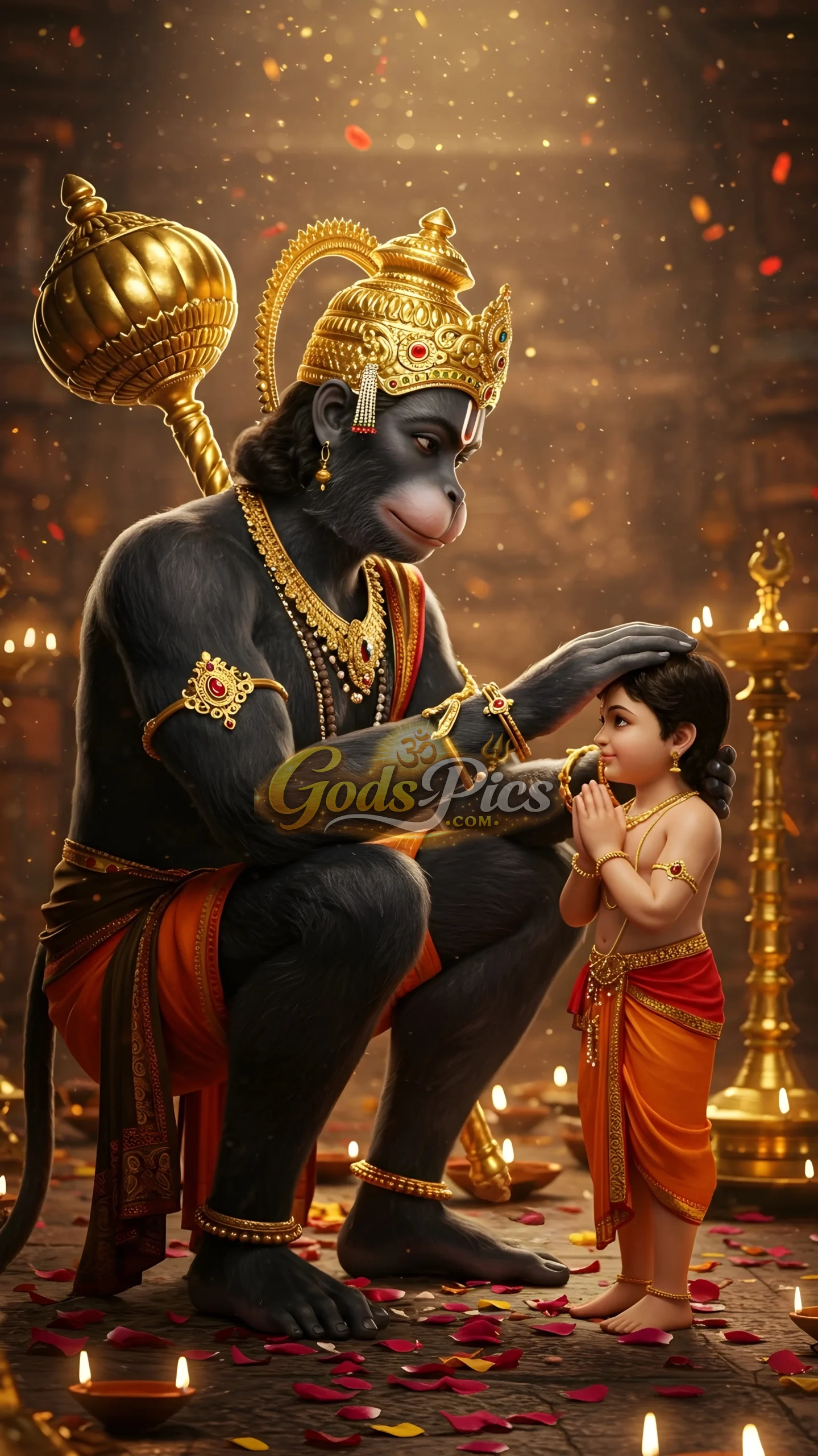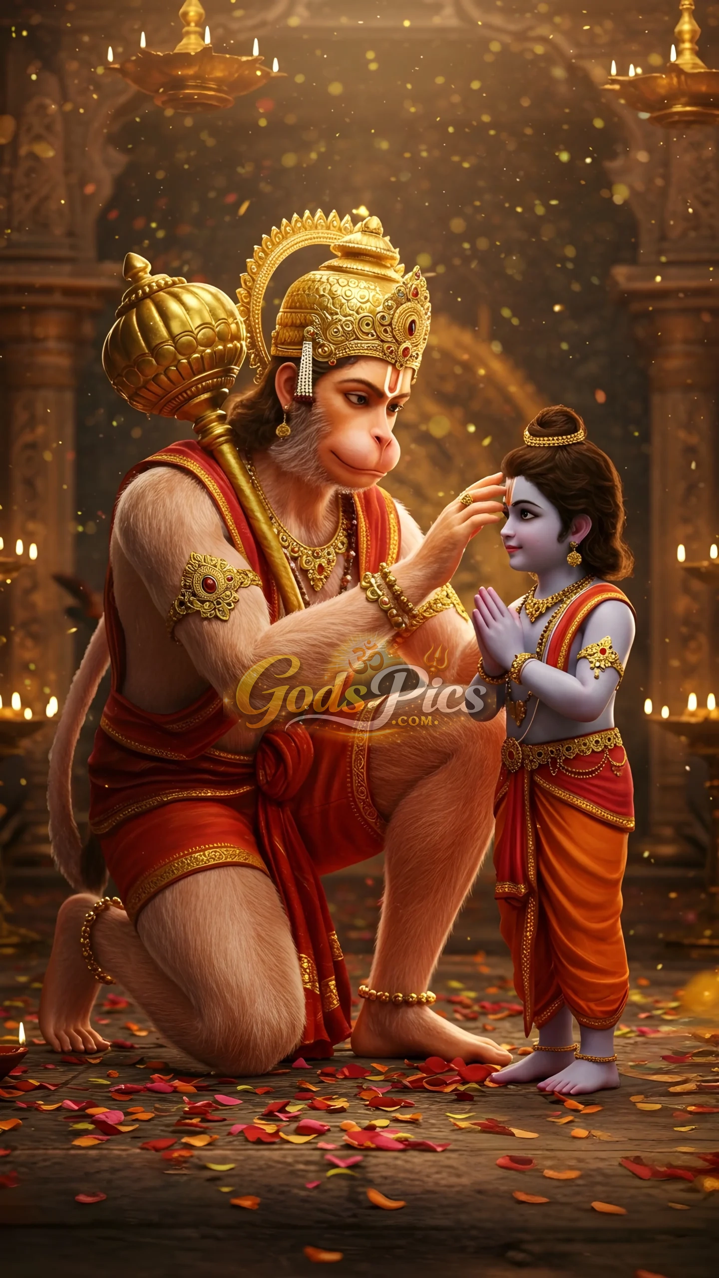 Rendered with rich golden lighting, intricate temple architecture, and lifelike expressions, these images evoke peace, strength, and spiritual inspiration. Every detail—from Hanuman ji’s gada to Shri Ram’s serene posture—has been crafted with artistic excellence and reverence.