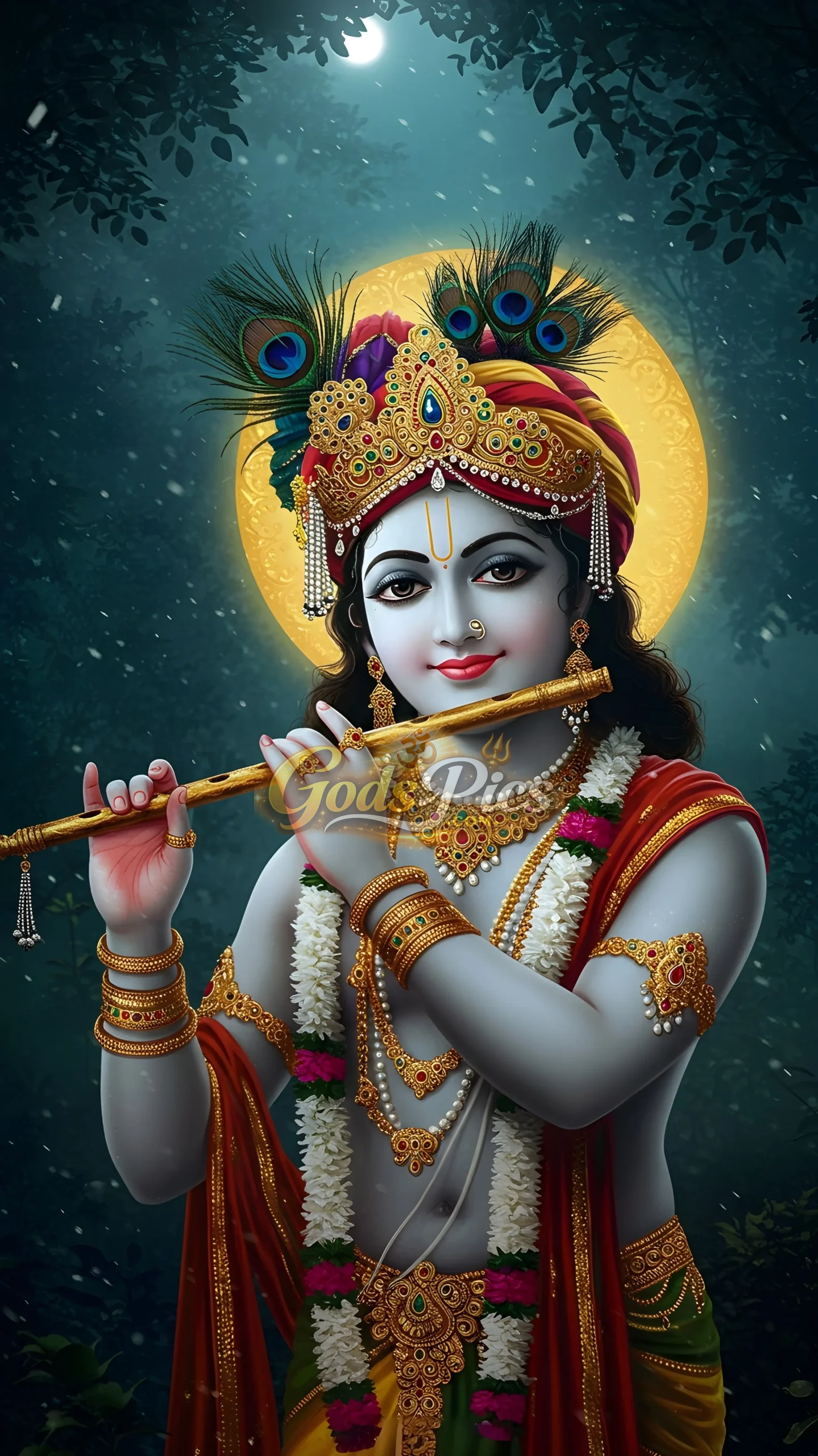 This is a high-quality digital artwork of Lord Krishna, beautifully depicted playing his divine flute beneath a glowing moonlight aura.