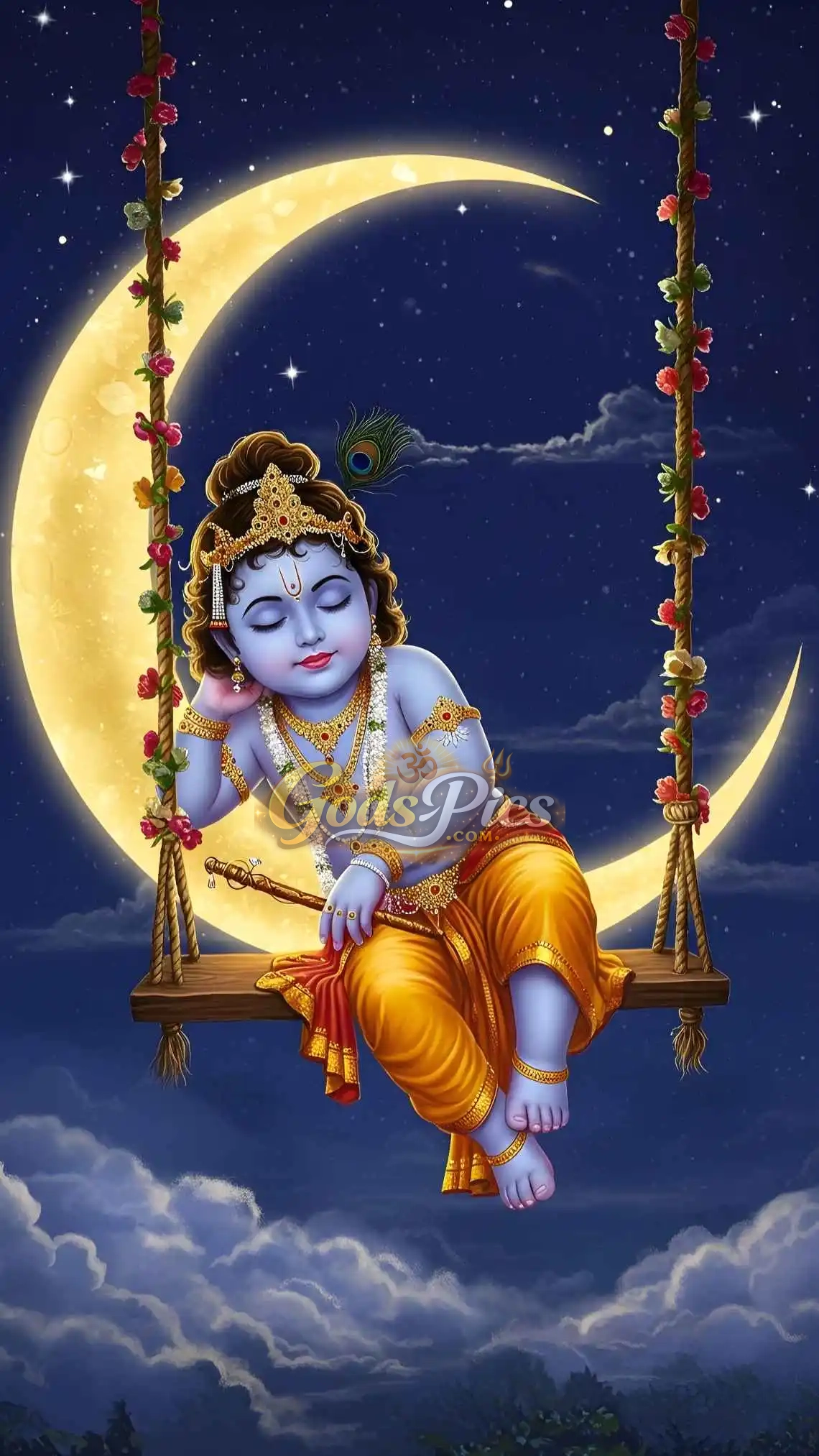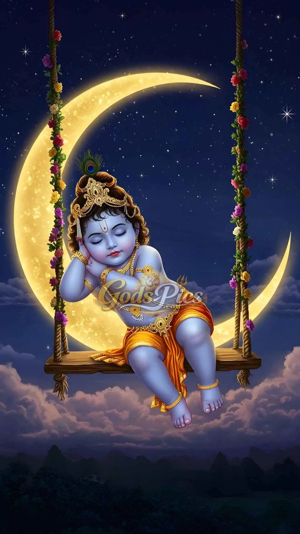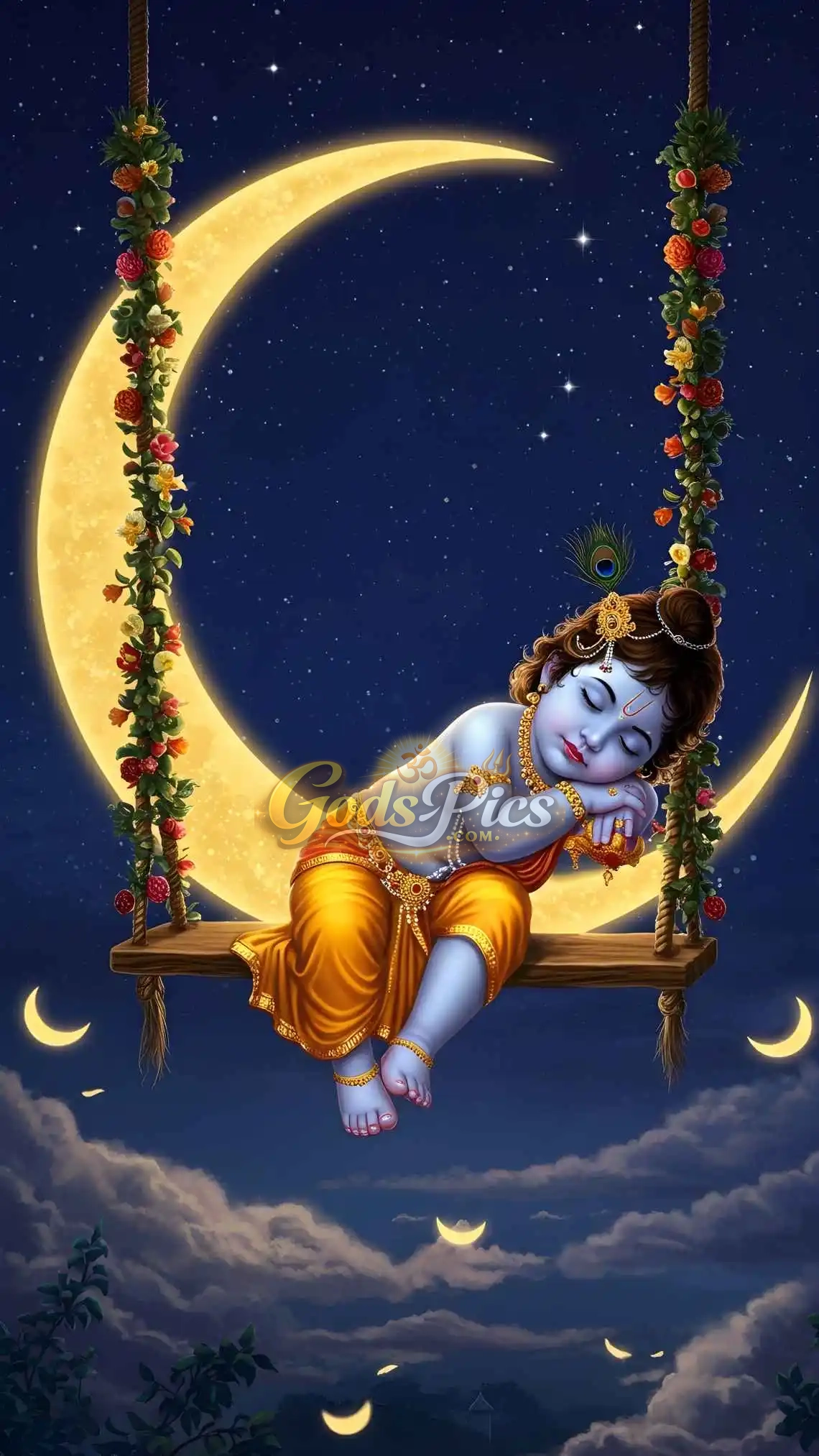 Subject: Divine Lord Krishna Sleeping In Moon– Premium Spiritual Digital Art (Set of 4 Images)