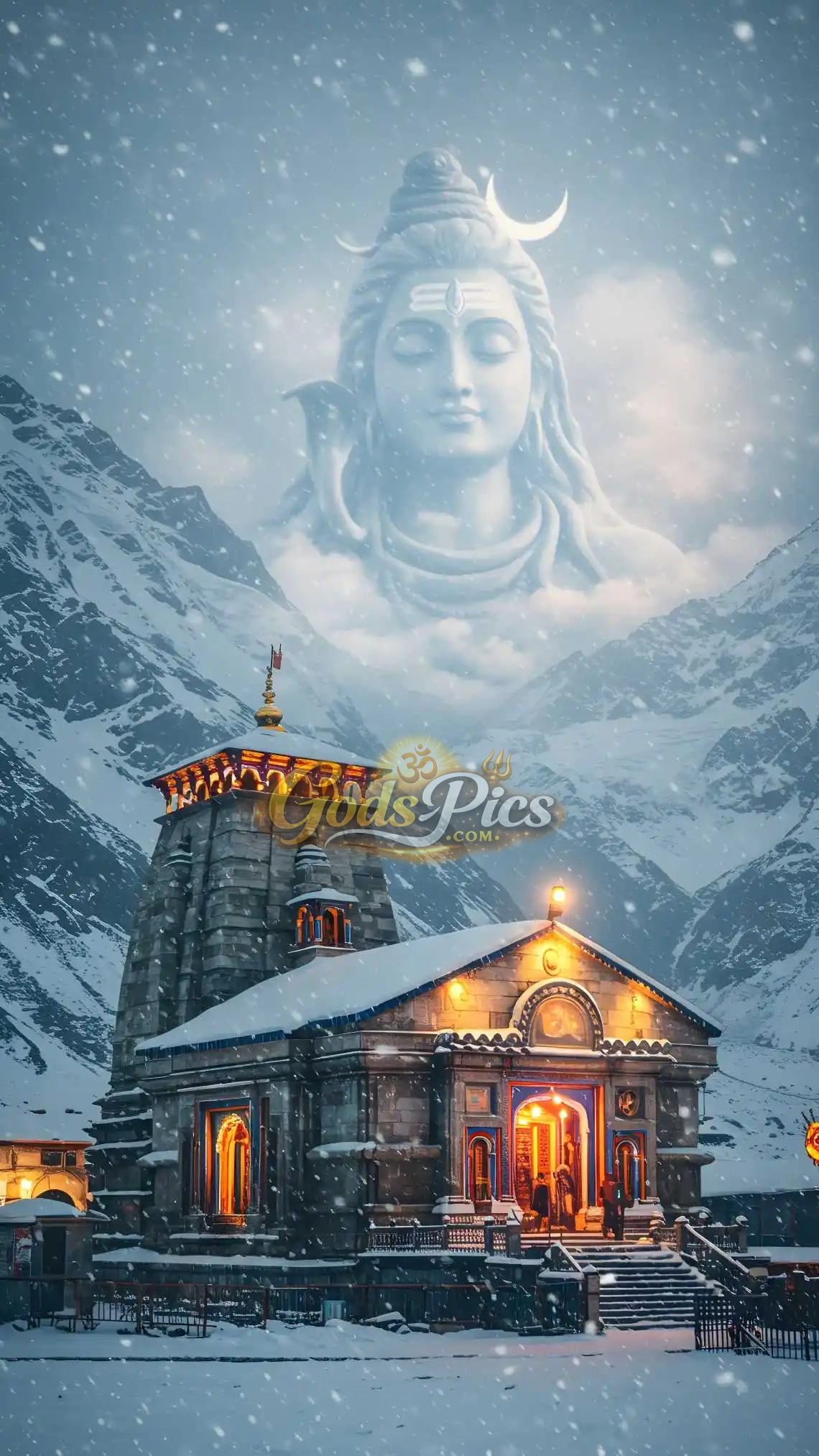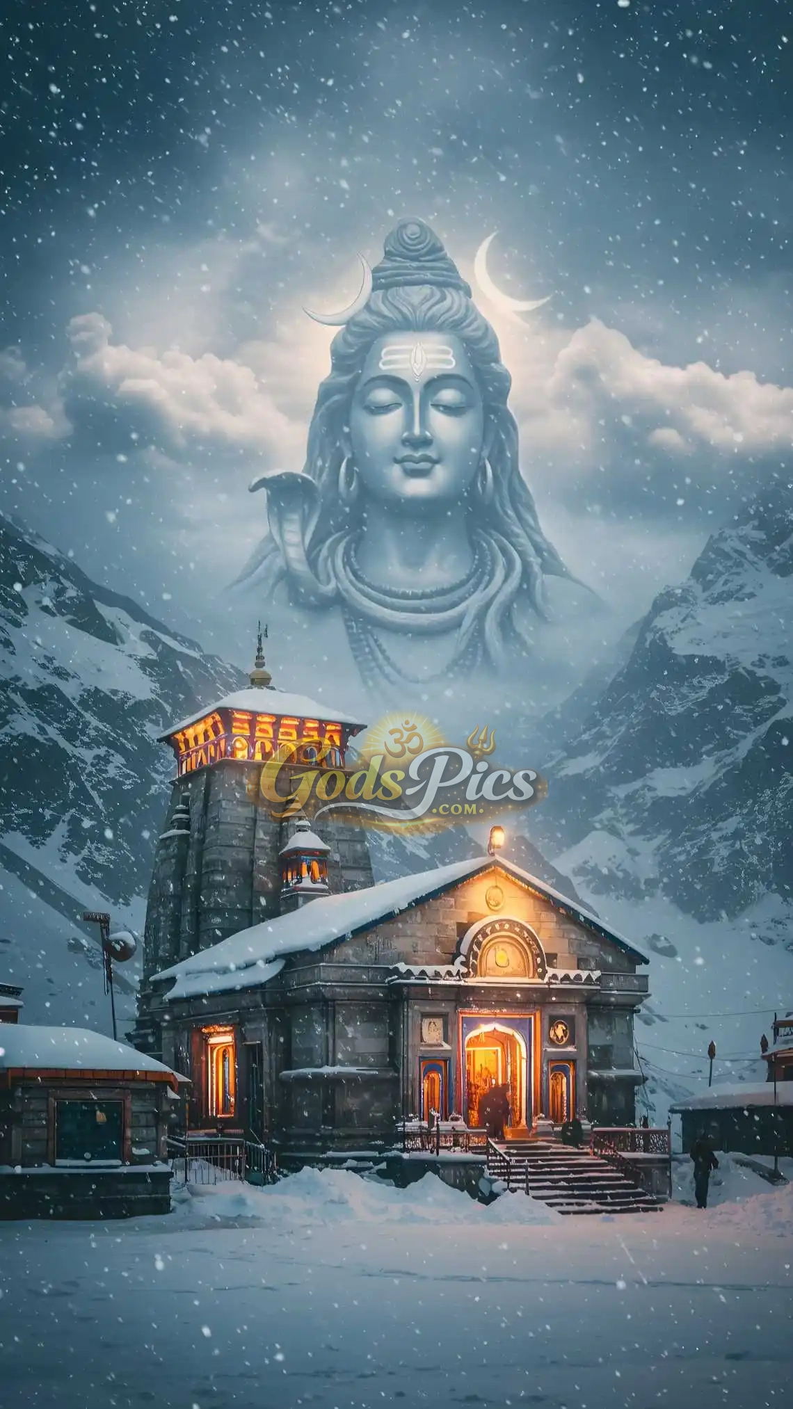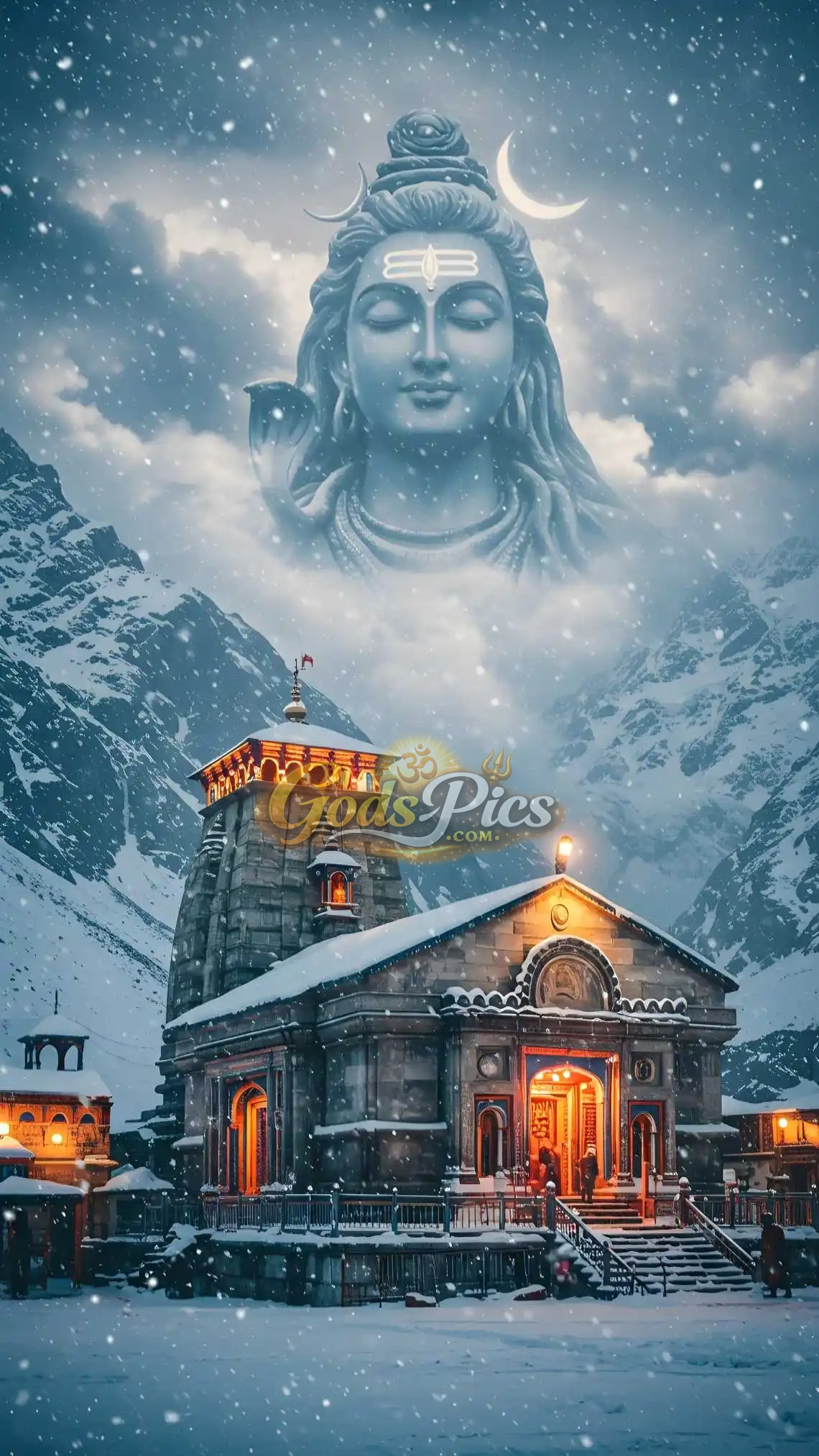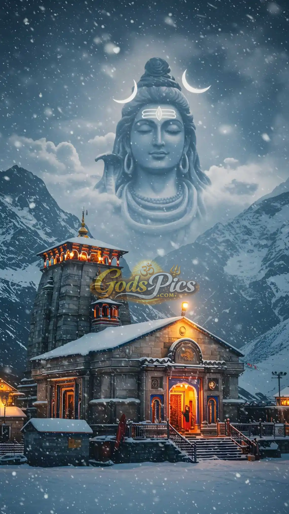 This is a high-quality digital artwork featuring Lord Shiva’s divine presence above a sacred Himalayan temple, surrounded by snow-covered mountains and falling snow.