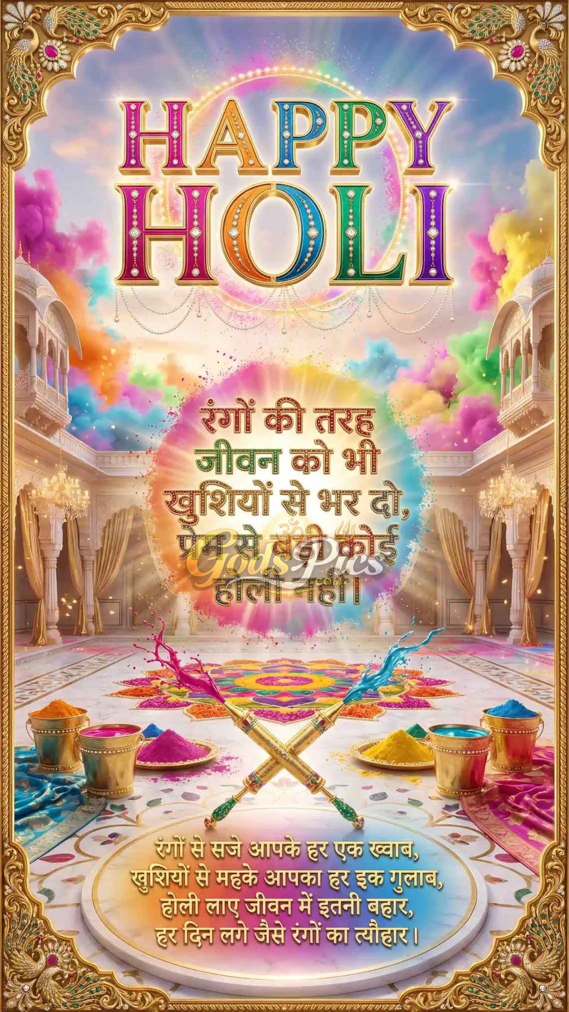 Golden stylish “होली” text aur bright gradient background is design ko premium look deta hai. Yeh poster social media post, WhatsApp greeting, print poster, banner ya shop decoration ke liye perfect hai.