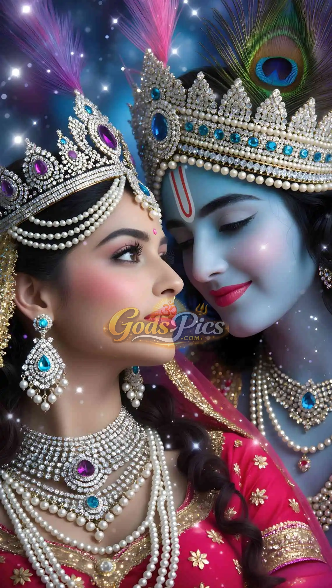 Lord Krishna is shown in his iconic blue form, symbolizing divinity and compassion, while Radha embodies grace, devotion, and eternal love. Their gentle expressions and traditional attire make this image ideal for spiritual inspiration, meditation, and artistic use.