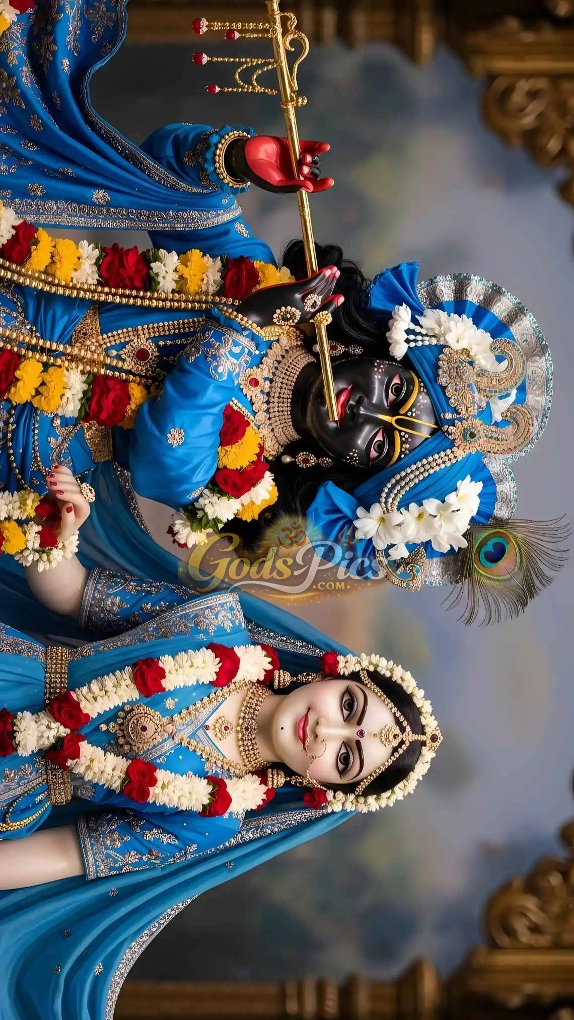 Lord Krishna is shown in his iconic blue form, symbolizing divinity and compassion, while Radha embodies grace, devotion, and eternal love. Their gentle expressions and traditional attire make this image ideal for spiritual inspiration, meditation, and artistic use.