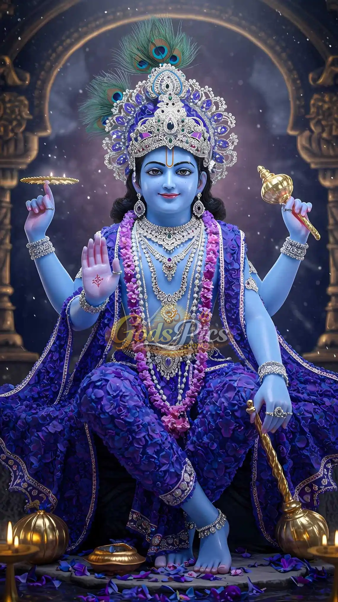 Holding divine attributes that signify protection of Dharma and destruction of negativity, Lord Krishna blesses devotees with fearlessness, harmony, and spiritual enlightenment. The deep celestial background, glowing lamps, and royal attire enhance the sacred aura of this artwork.