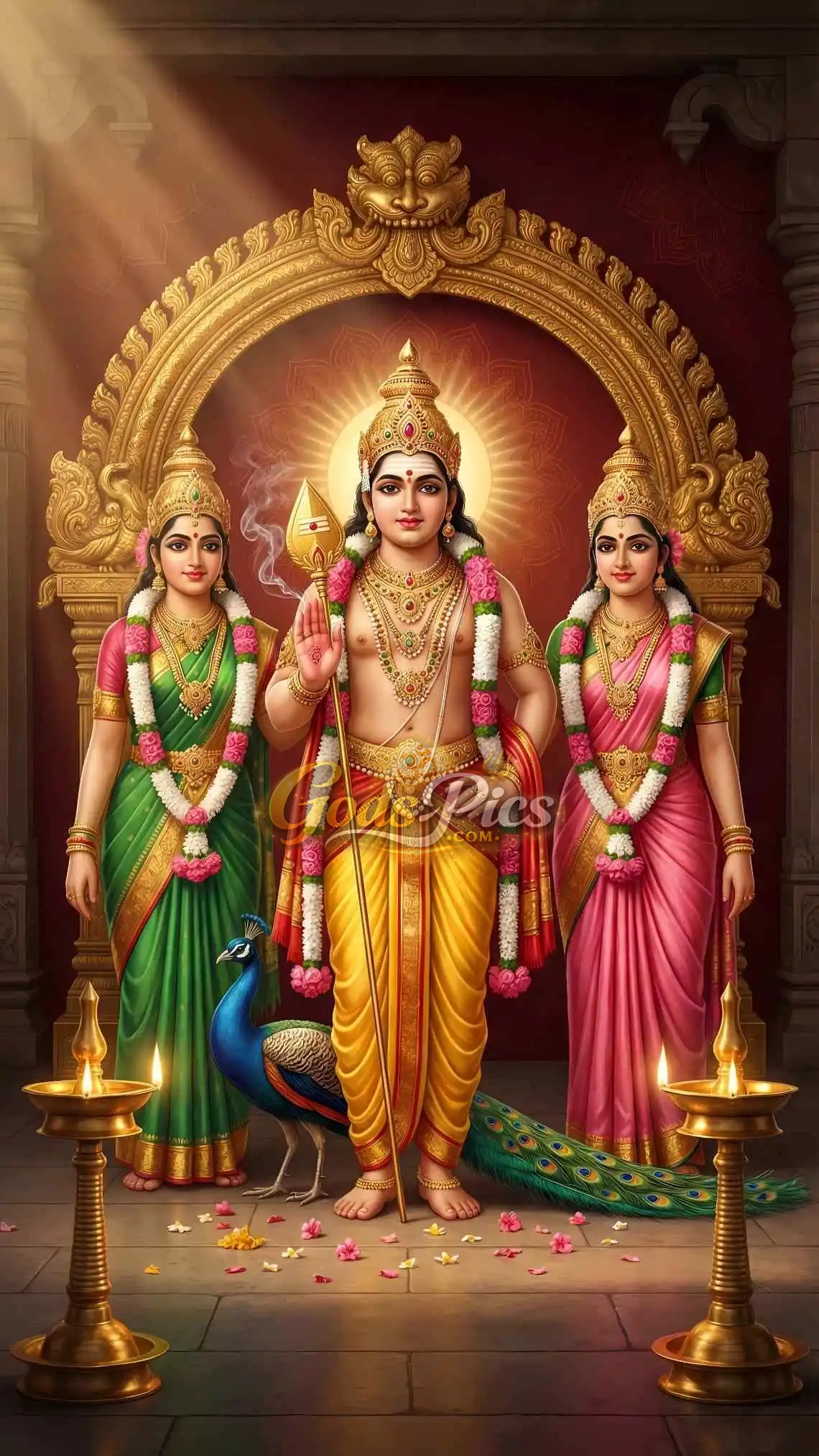 On either side stand his divine consorts, Goddess Valli and Goddess Devasena, representing devotion, love, prosperity, and spiritual balance. The peacock at his feet symbolizes pride transformed into wisdom and spiritual strength.