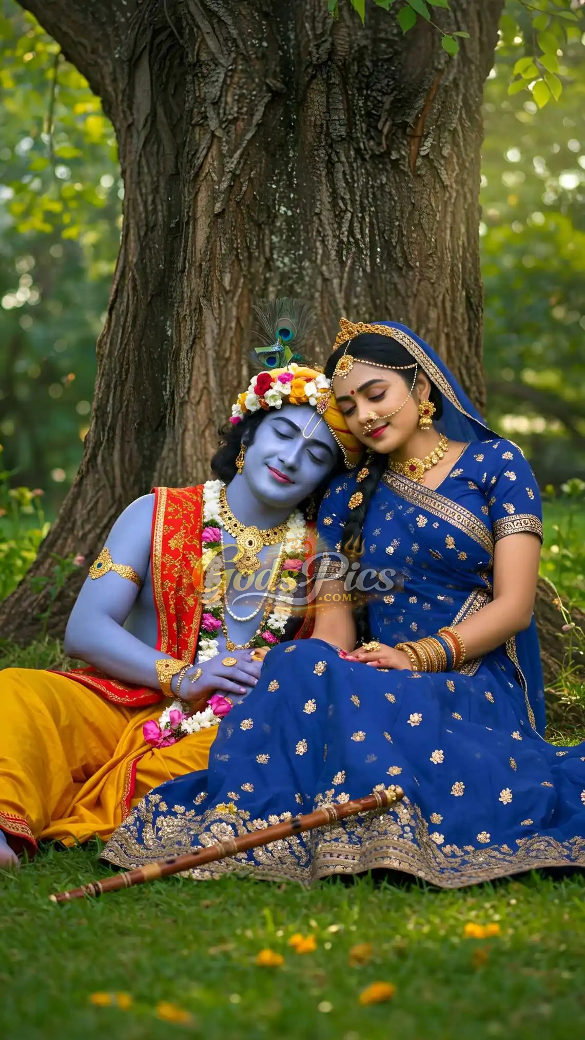 Experience the timeless beauty of Radha and Lord Krishna’s divine love through this serene high-resolution devotional image. Captured in a peaceful natural setting beneath a lush tree, this artwork reflects harmony, devotion, and spiritual bliss.
