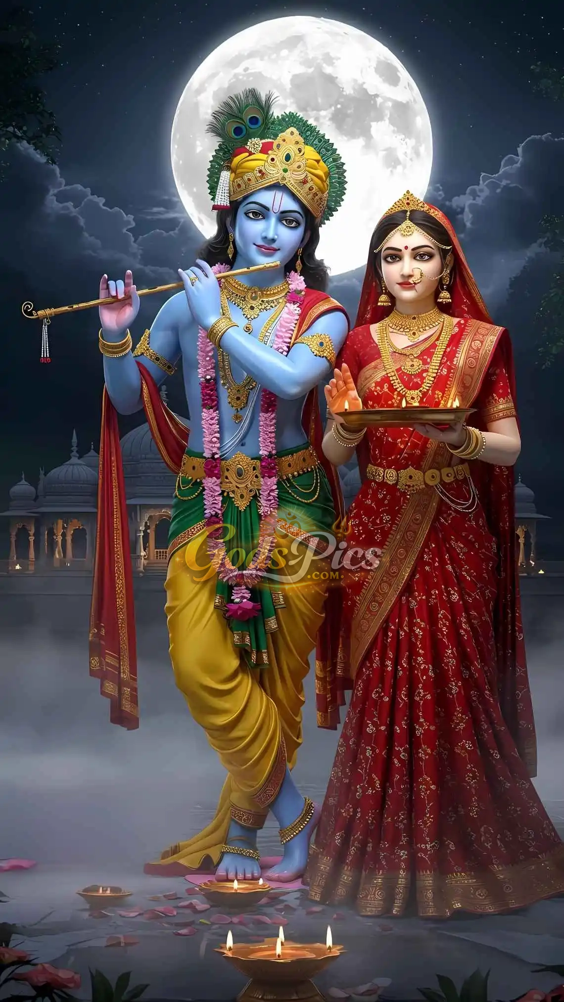 Experience the timeless beauty of Radha and Lord Krishna’s divine love through this serene high-resolution devotional image. Captured in a peaceful natural setting beneath a lush tree, this artwork reflects harmony, devotion, and spiritual bliss.